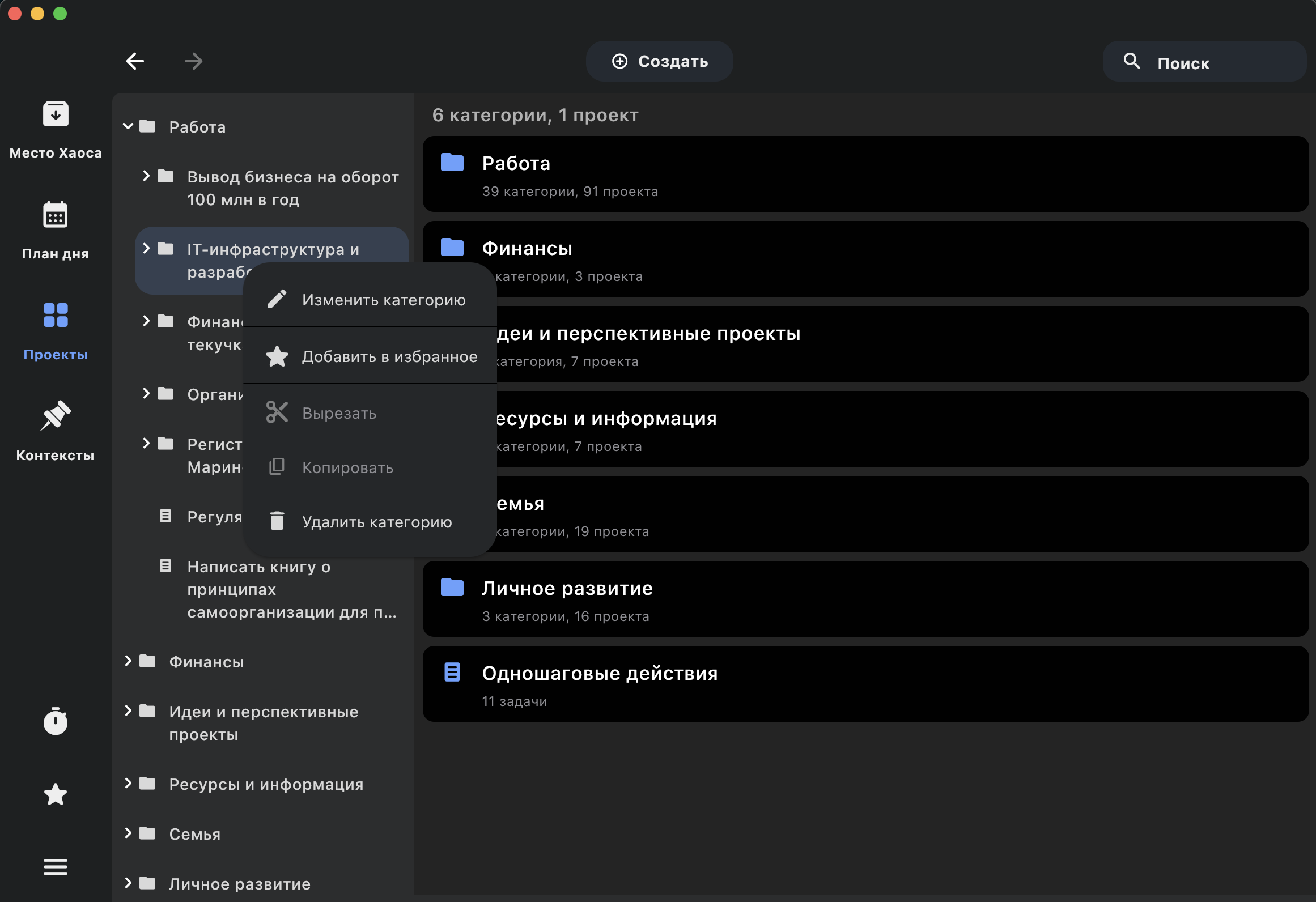 В частности, теперь у дерева навигации есть контекстное меню, с помощью которого можно отредактировать и удалить категории/проекты/контексты, а также выполнить другие действия: