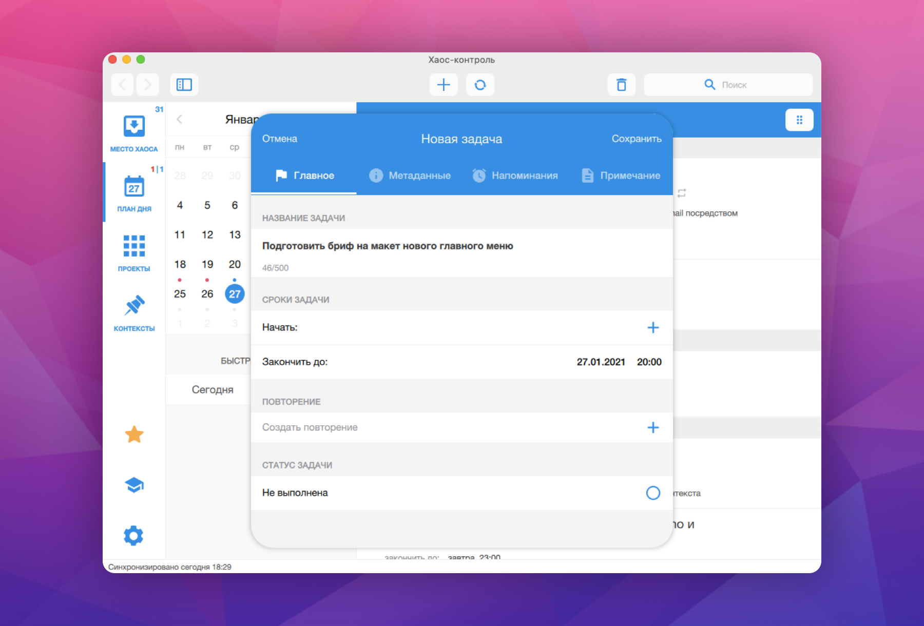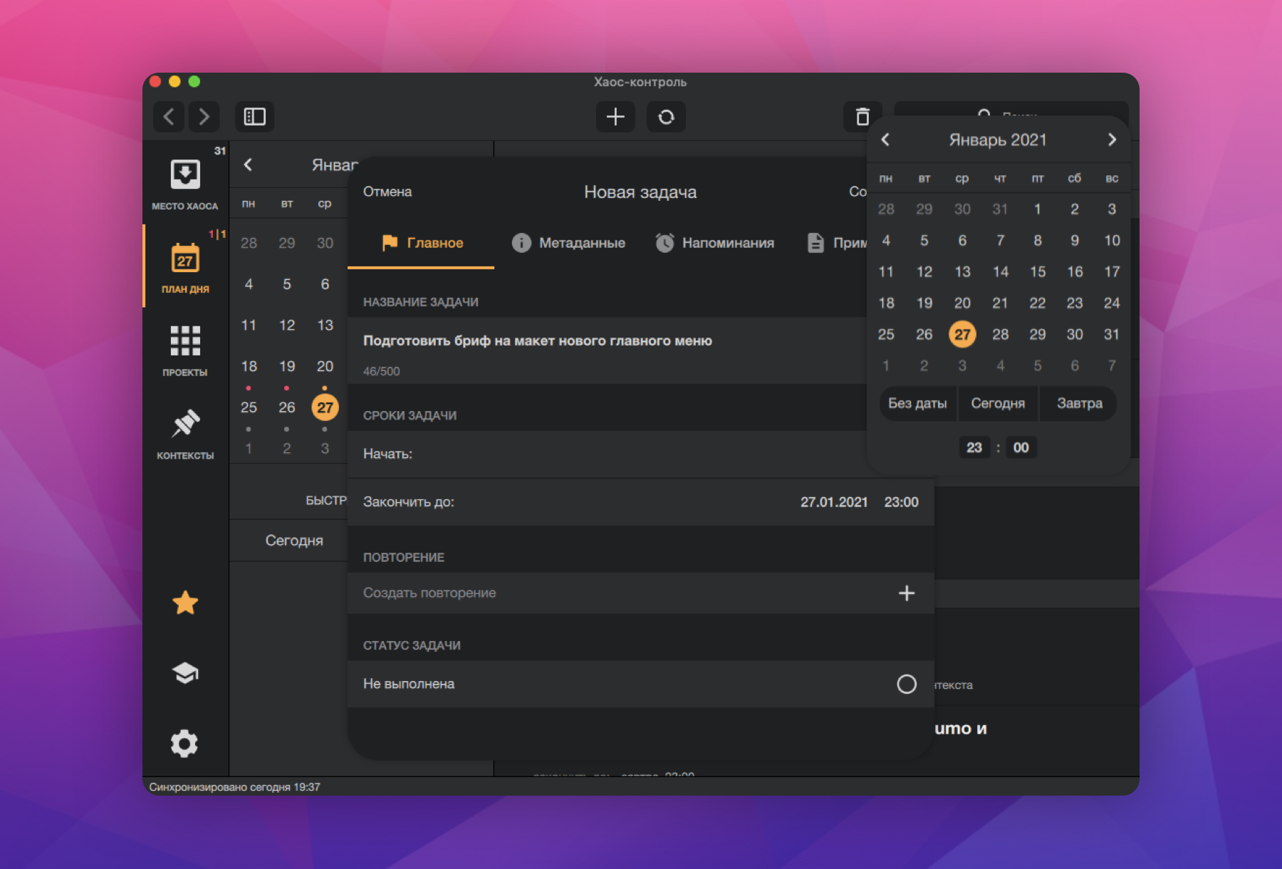 Хочется сказать, что разделение диалога создания на вкладки сделано для повышения скорости создания задач, но, честно говоря, это больше нужно для того, чтобы в будущих функциях добавлять новые функции и атрибуты задач и проектов. Вроде множественных контекстов, файлов, подчиненных и так далее.