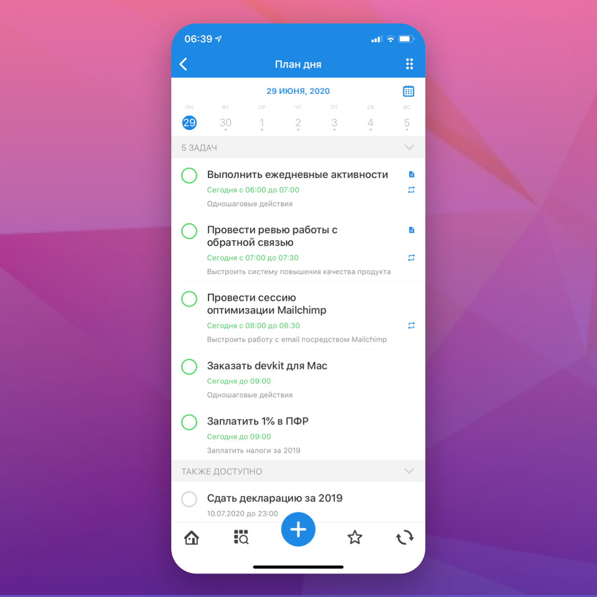 Чем дальше в структуре папок лежит проект, тем меньше вероятность, что он будет открыт и выполнен. Поэтому для большинства пользователей основная точка входа в любой органайзер - список дел на сегодня (раздел “План Дня” в ХК). В результате этот список содержит десятки несвязанных задач разной трудоемкости и похож на кровавое месиво. Такой инструмент больше мешает, чем помогает, превращая каждый божий день в бурление текучки.
