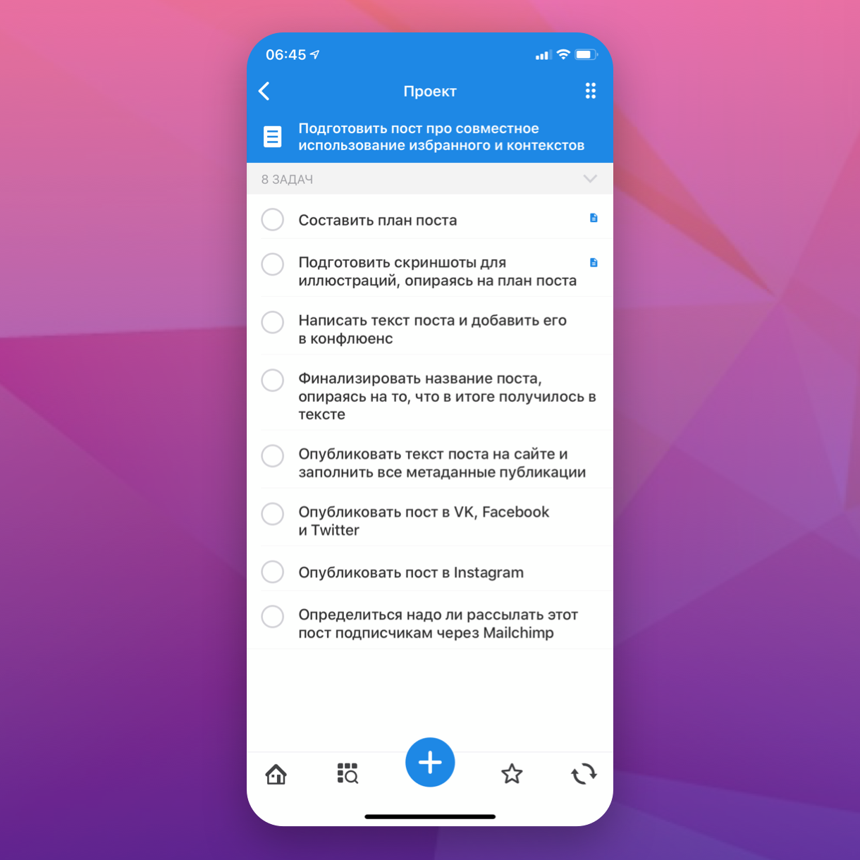 Разобравшись с рутинными задачами в первые пару часов рабочего дня, я приступаю к работе над проектами, каждый из которых представляет собой комплексную задачу, разбитую на шаги. Вот как выглядит проект, посвященный написанию этой заметки: