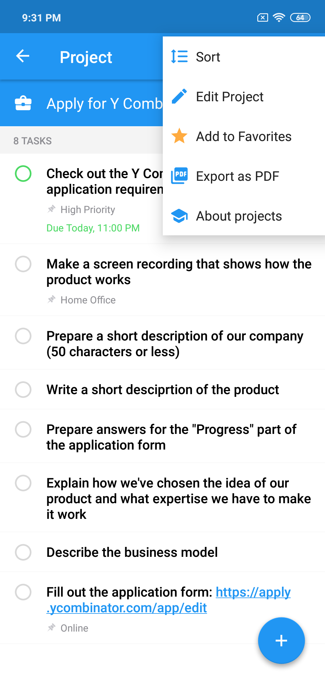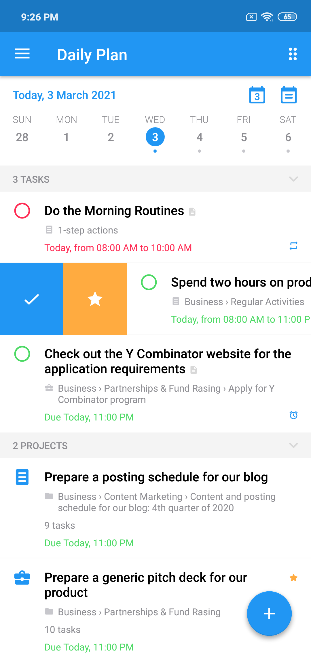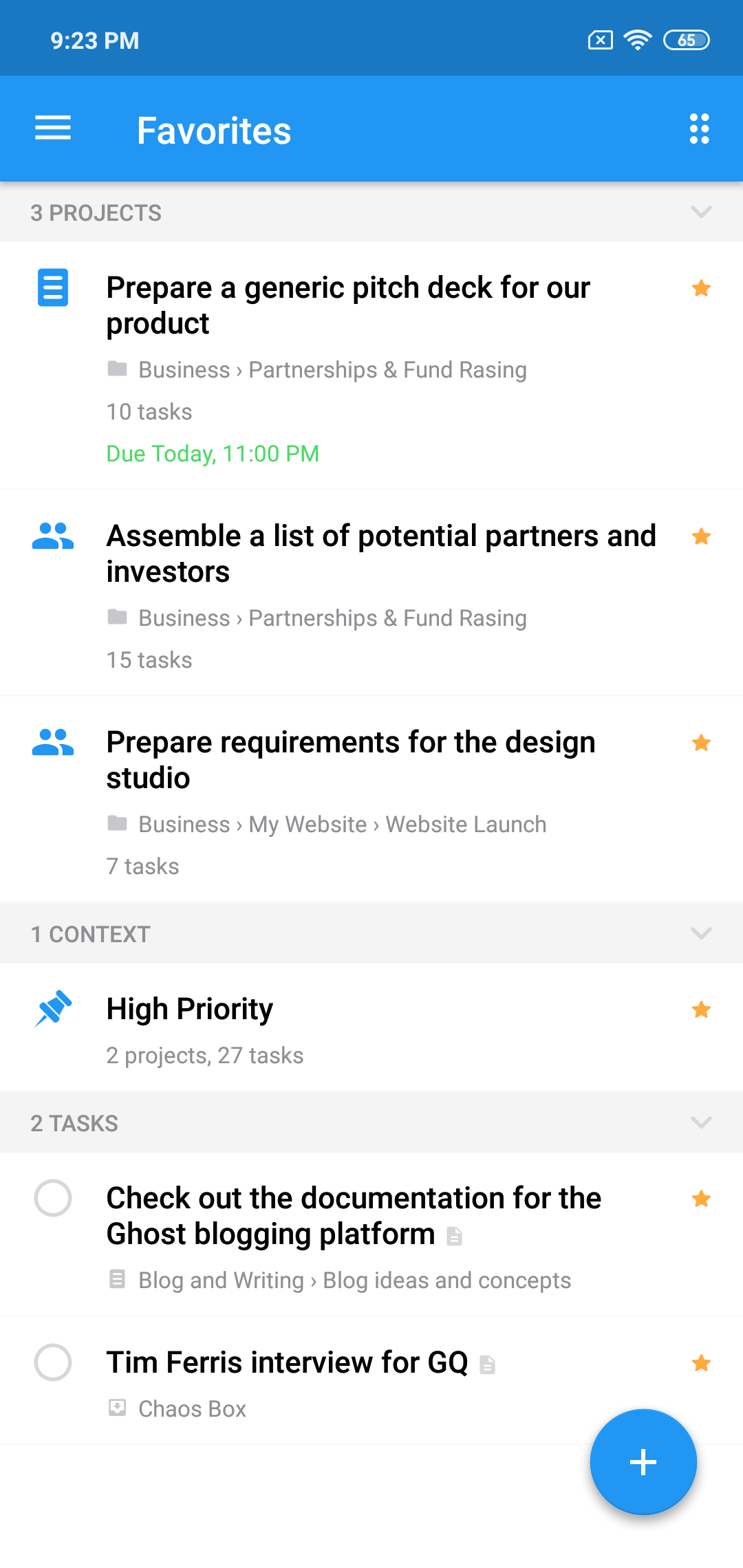 Also, you can use Favorites to declutter your Daily Plan. Let's say you have 2 or 3 projects with tasks that should be handled today. Instead of adding them to today's task list, you can add their corresponding projects/contexts to Favorites. Thus, in your Daily Plan you can replace the bloodbath of tasks with one simple task like "work on the starred projects."
