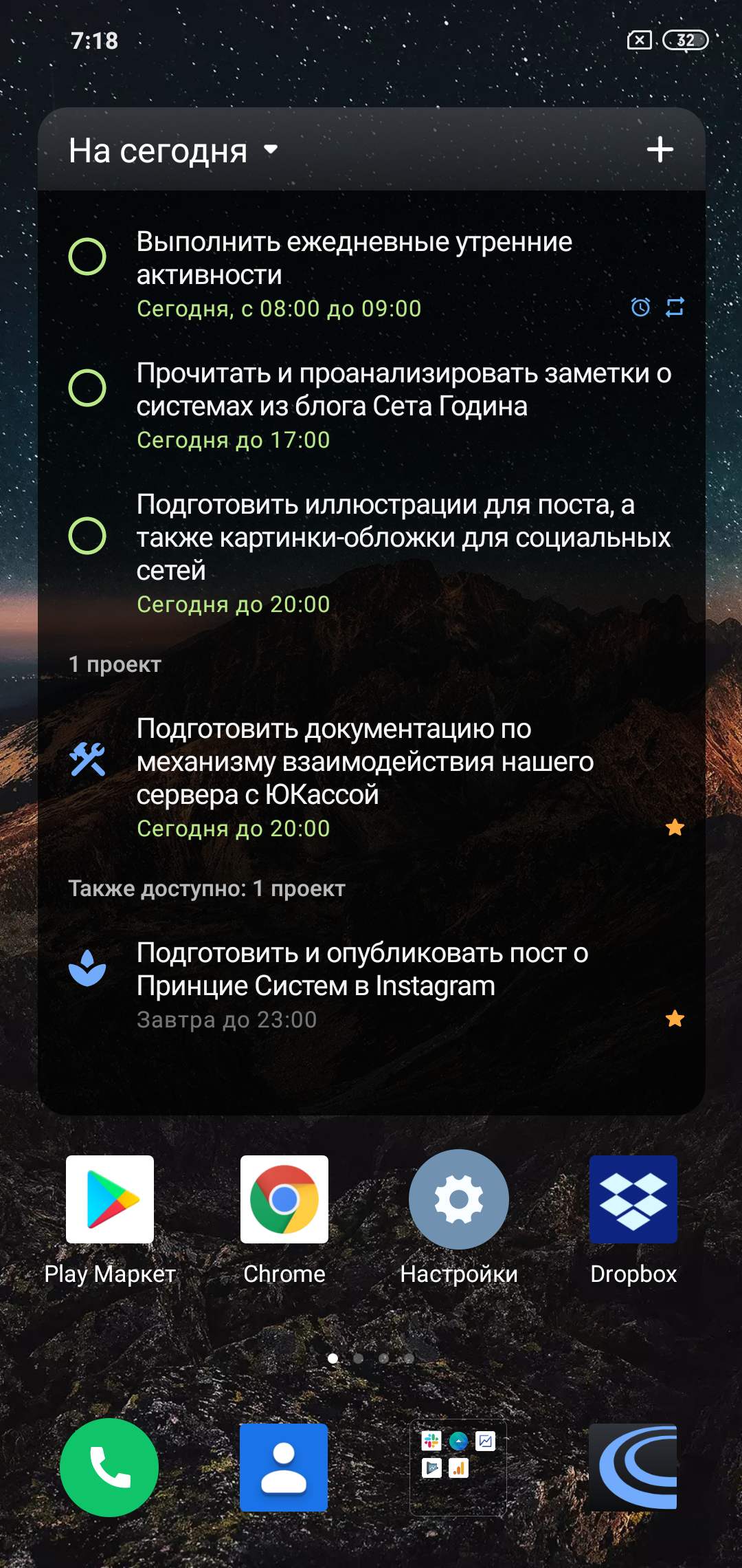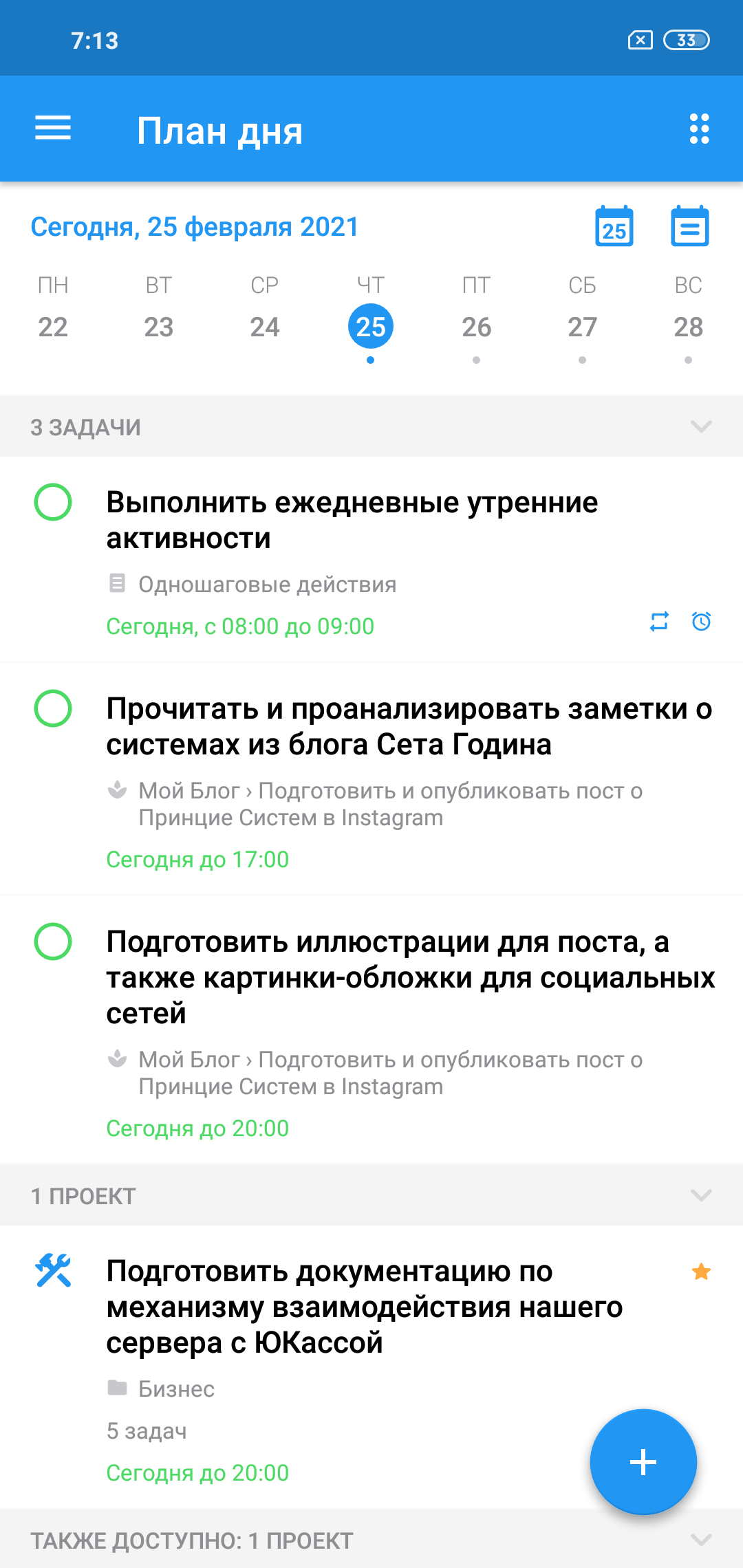 - План Дня должен, по возможности, содержать до 5-6 задач и максимум 1-2 проекта. Да, в течение дня у вас может быть существенно больше дел, чем 5-6, но План Дня, как мы решили в первом пункте, - это список для задач, имеющих жесткую привязку к дате. Для всех остальных случаев лучше использовать Проекты, Контексты и секцию «Также доступно» Плана Дня, где задачи группируются по признакам дедлайна проекта, по цели, контексту и т.д.