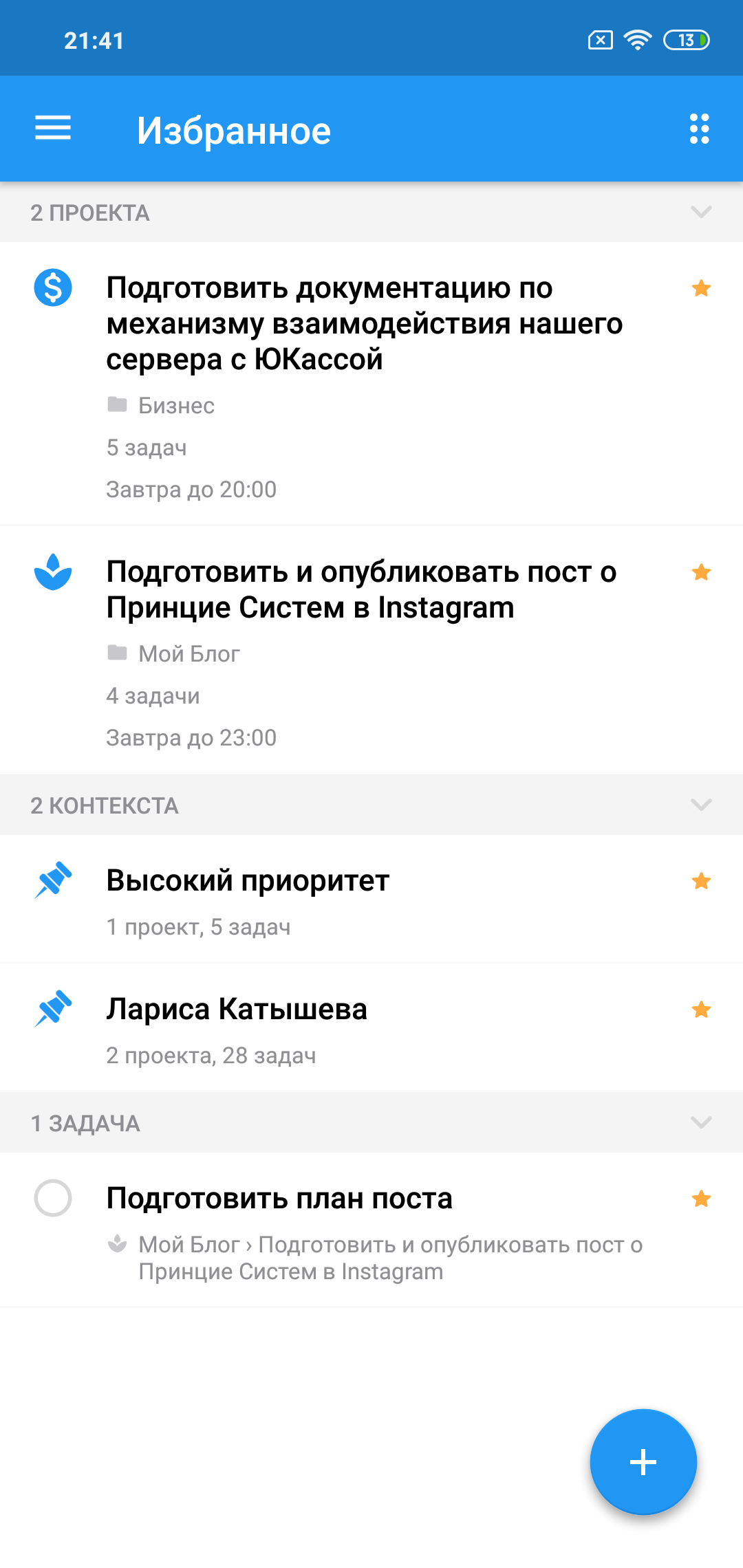 Любой проект, контекст или задачу можно добавить в избранное. Помеченные звездочкой объекты попадают в одноименный раздел, который всегда доступен для быстрого открытия на нижней панели инструментов: