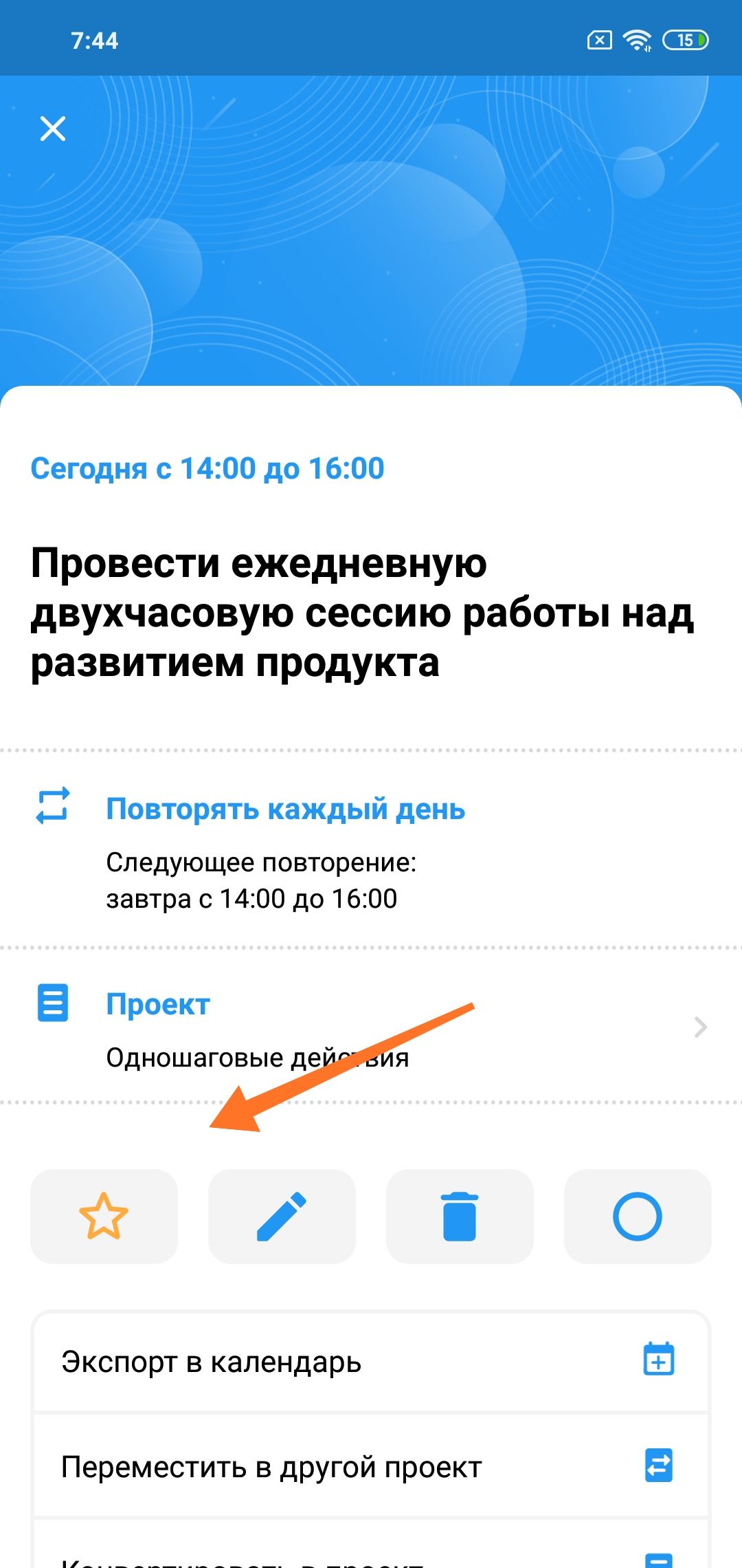 Добавить задачу, проект или контекст в избранное можно тремя способами: