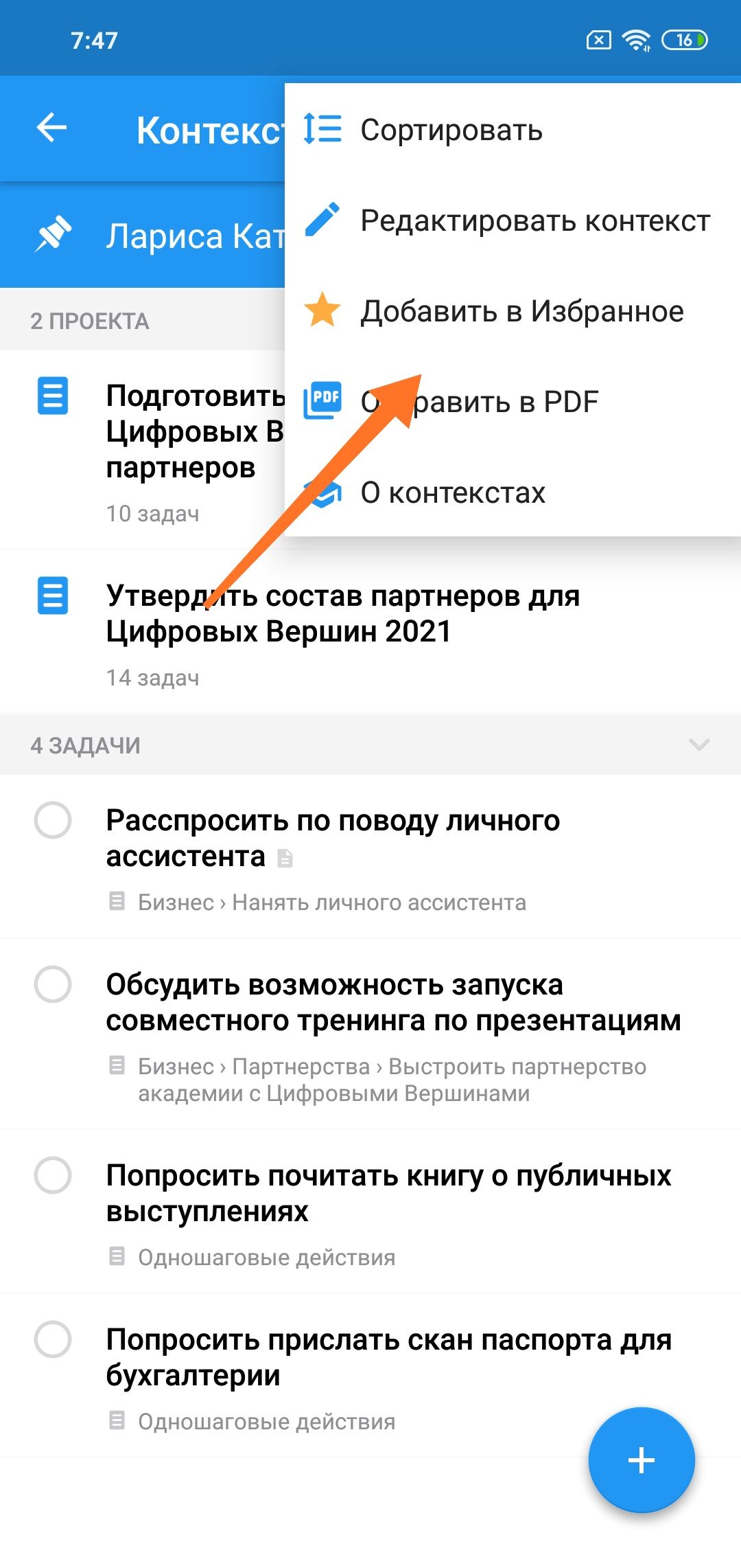 Дополнительно контексты и проекты можно добавить в избранное с помощью контекстного меню во время просмотра соответствующего контекста/проекта: