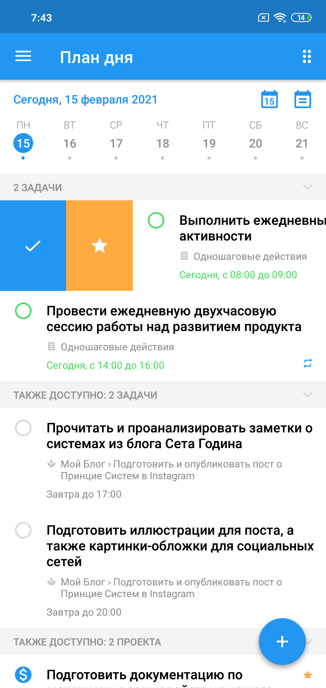 Кстати, с помощью избранного можно разгрузить свой список дел на сегодня. Например, если вам в течение дня предстоит выполнить большое количество однотипных или простых задач из одного-двух проектов, то можно добавить эти проекты в избранное, а на сегодня создать задачу "Выполнить задачи из Избранного". В этом случае "На сегодня" не будет перегружен задачами из этих проектов, но при этом будет содержать четкое указание, что нужно над ними поработать.