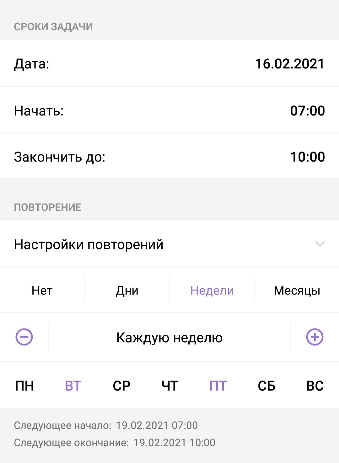 Созданная таким образом задача будет отображаться в Плане Дня в каждые вторник и пятницу.