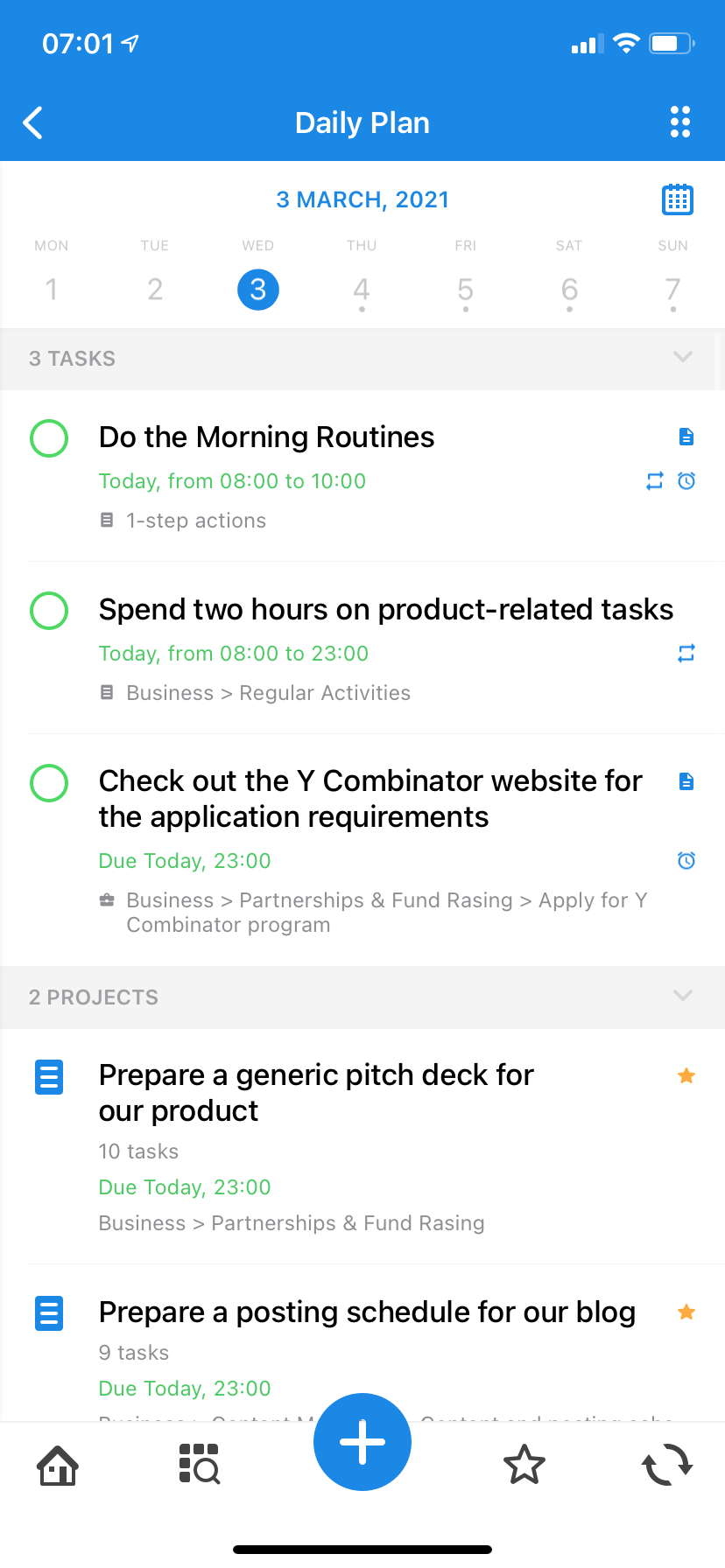 - Ideally, your Daily Plan should contain up to 6 tasks. Even though during your typical day you probably do much more than that, use the Daily Plan for actions with strict deadlines and project or context lists for those with more flexibility.