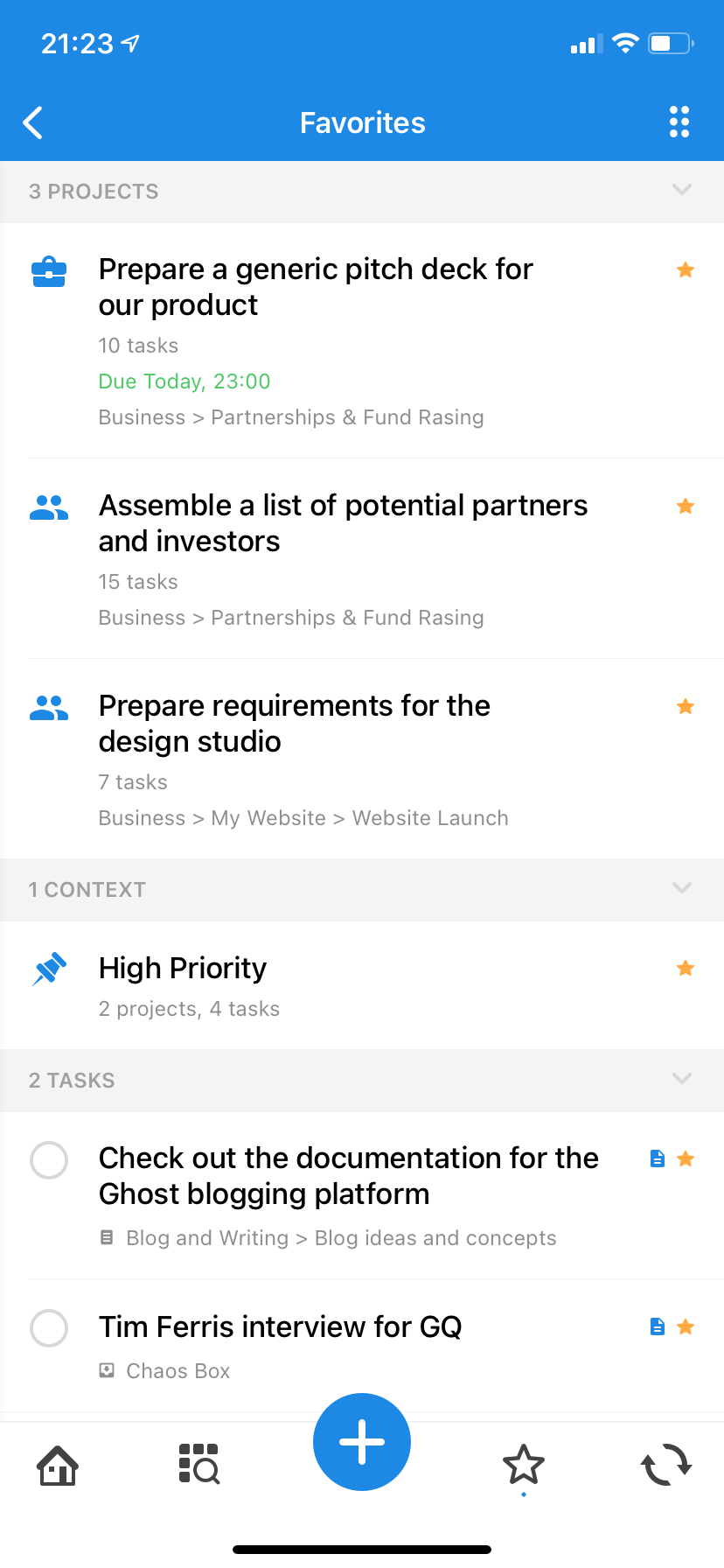 You can mark any project, context or task with a ⭐. All marked lists and tasks are gathered in the special "Favorites" list which can be easily accessed from the Chaos Control toolbar.