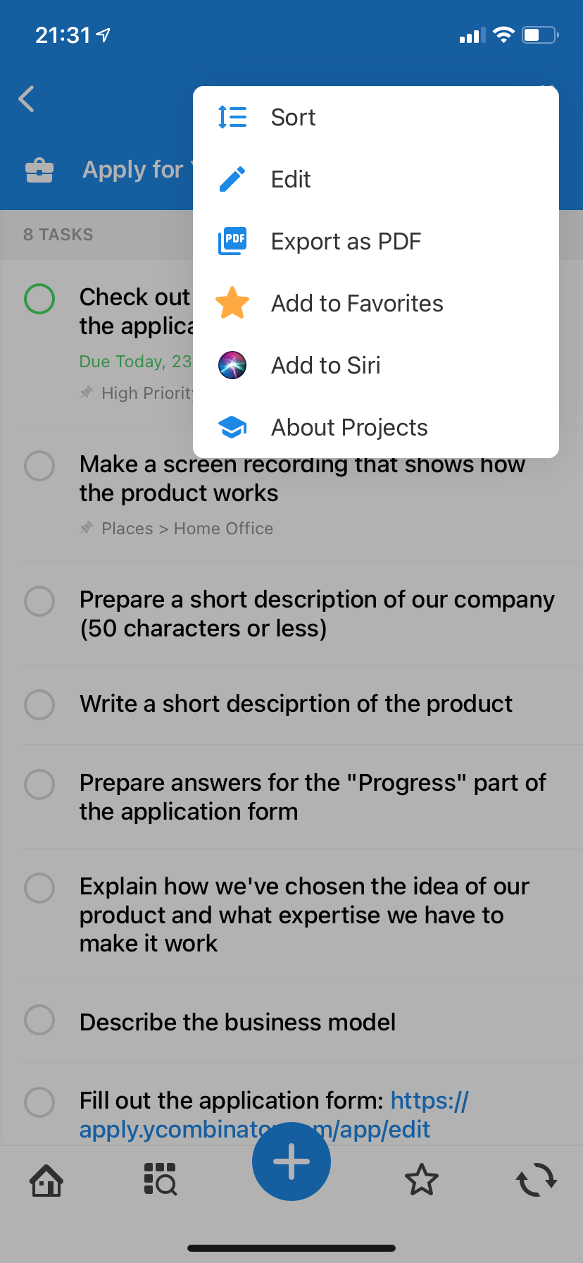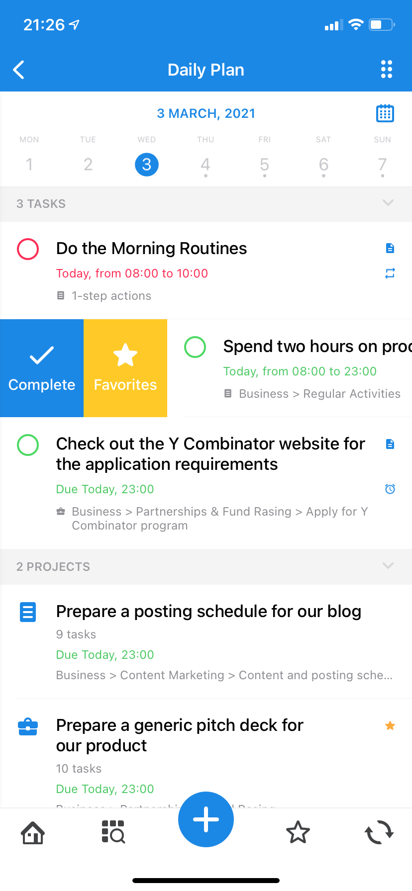 Also, you can use Favorites to declutter your Daily Plan. Let's say you have 2 or 3 projects with tasks that should be handled today. Instead of adding them to today's task list, you can add their corresponding projects/contexts to Favorites. Thus, in your Daily Plan you can replace the bloodbath of tasks with one simple task like "work on the starred projects."