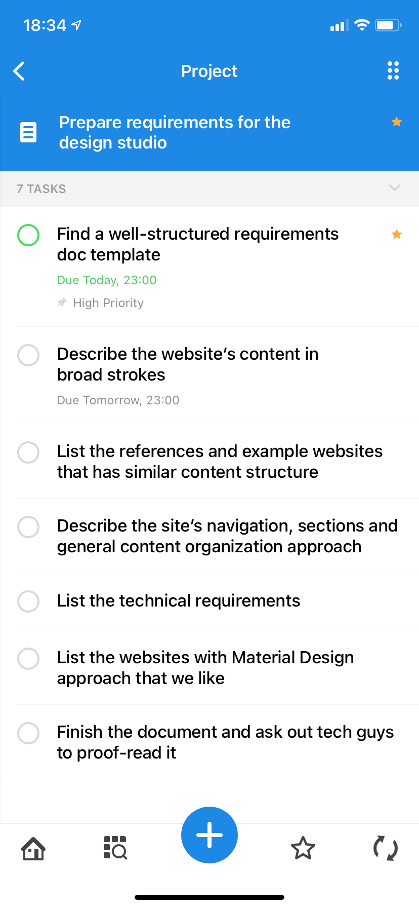 As soon as we create these projects, it becomes much easier to formulate a set of requirements to be used by developers and designers. Therefore, it makes sense to add a project called "Prepare a requirements doc for the design studio" in the same folder: