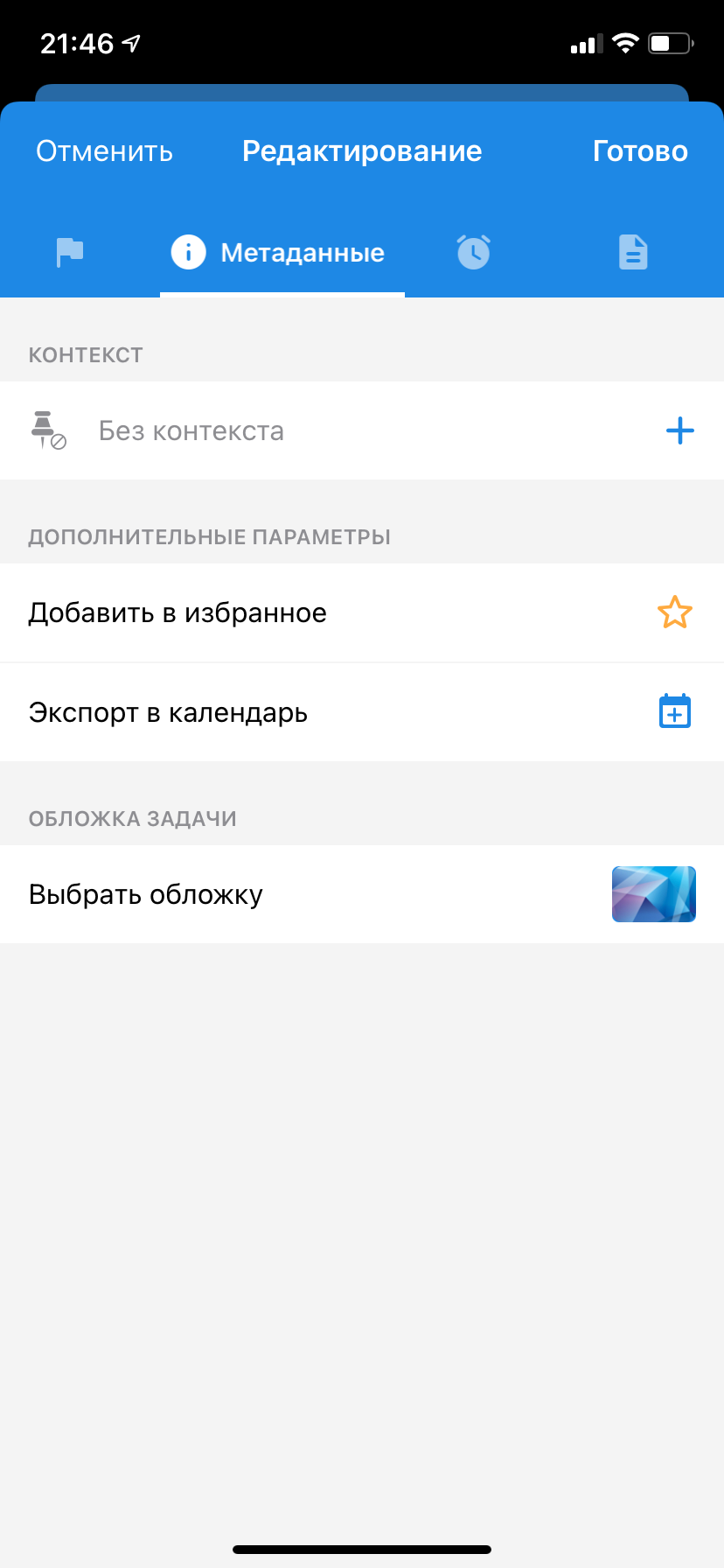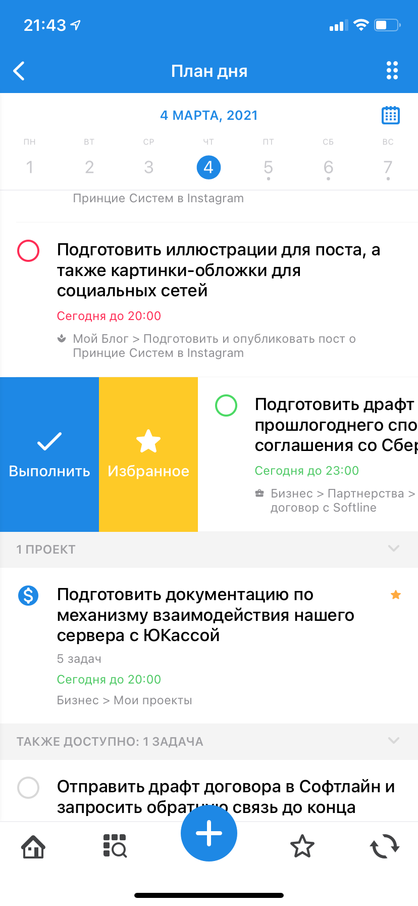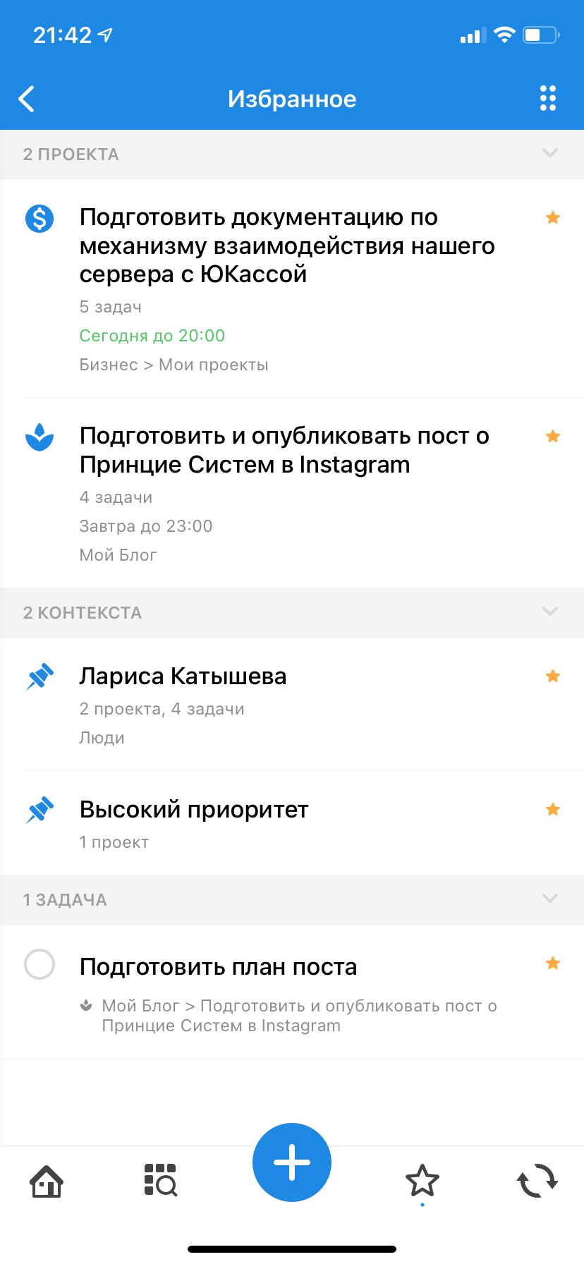 Любой проект, контекст или задачу можно добавить в избранное. Помеченные звездочкой объекты попадают в одноименный раздел, который всегда доступен для быстрого открытия на нижней панели инструментов: