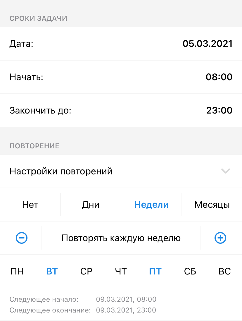 Созданная таким образом задача будет отображаться в Плане Дня в каждые вторник и пятницу.