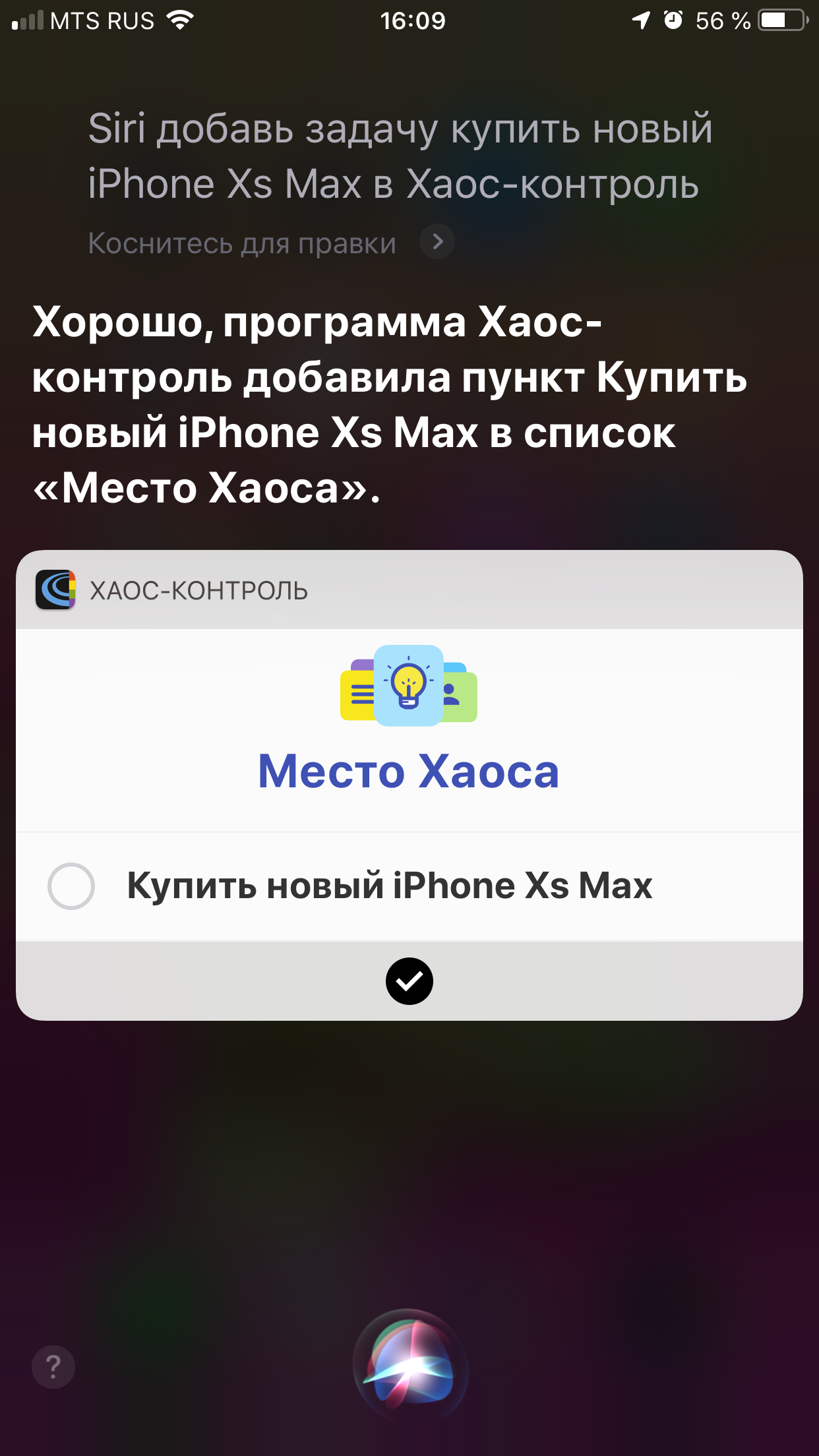 - Siri, добавь задачу "позвонить маме" в Хаос-контроль