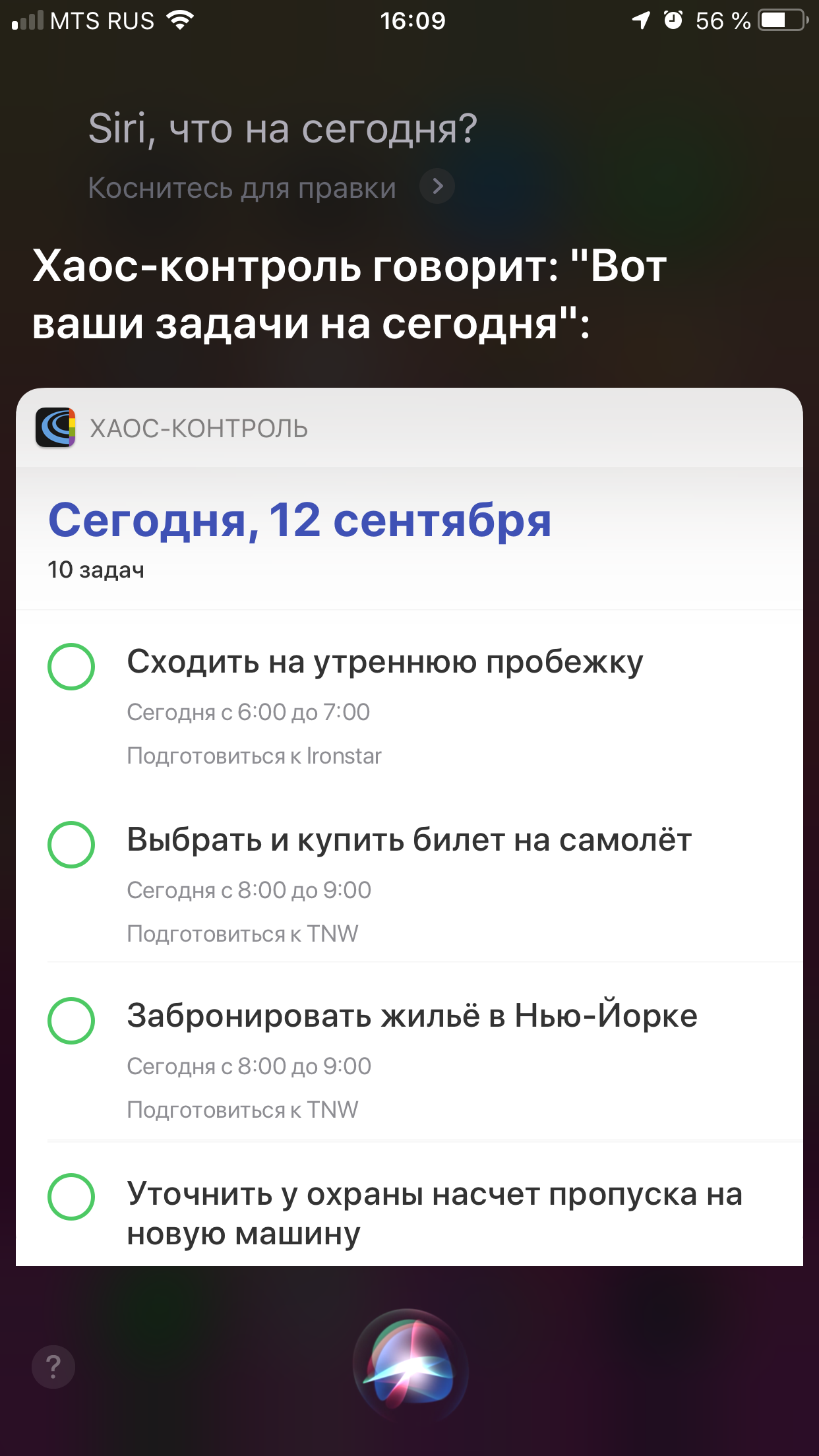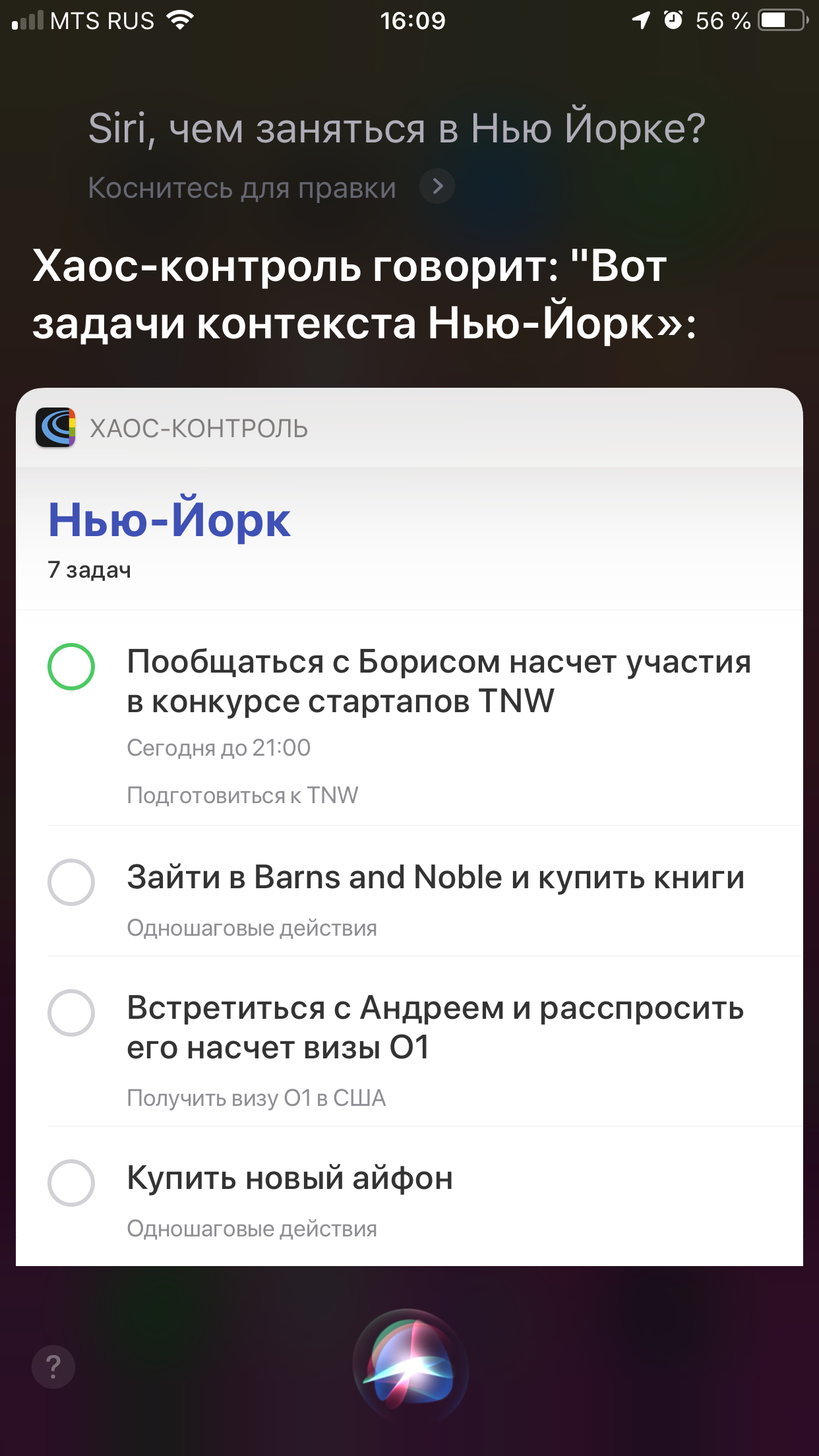 При этом Siri понимает фразы, построенные по-разному. В команды можно добавлять дату и время - в этом случае Хаос-контроль создаст задачу с напоминанием.