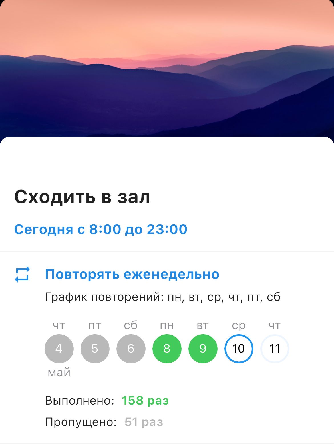 Допустим, у вас есть желание стать атлетом, а в ХК2 у вас есть повторяющаяся задача «Сходить в зал». Статистика выполнения этой задачи может помочь сделать выводы насколько хорошо у вас получается двигаться к этой цели: