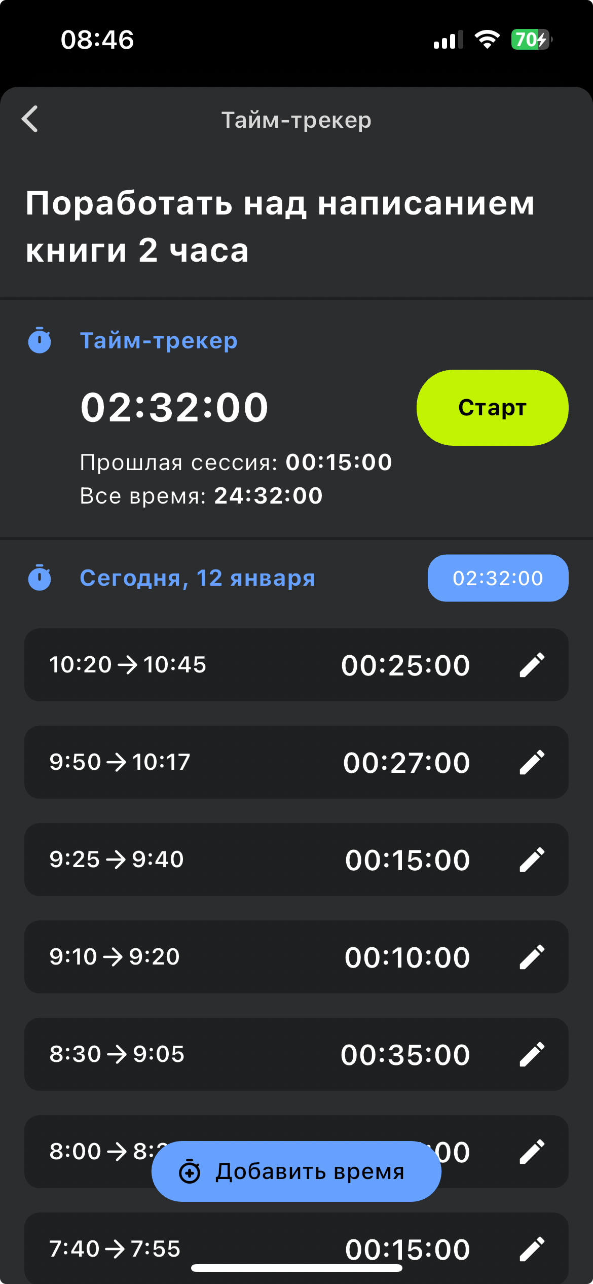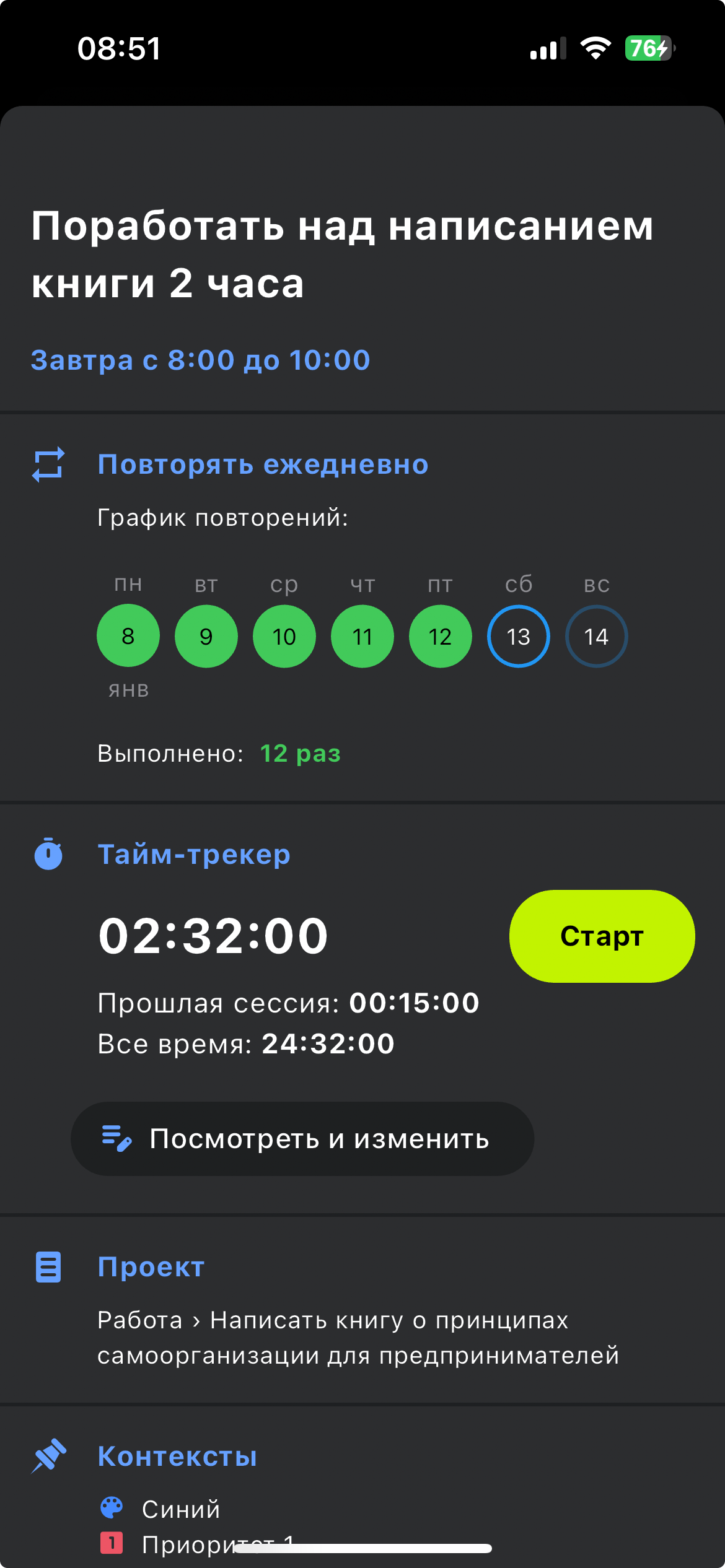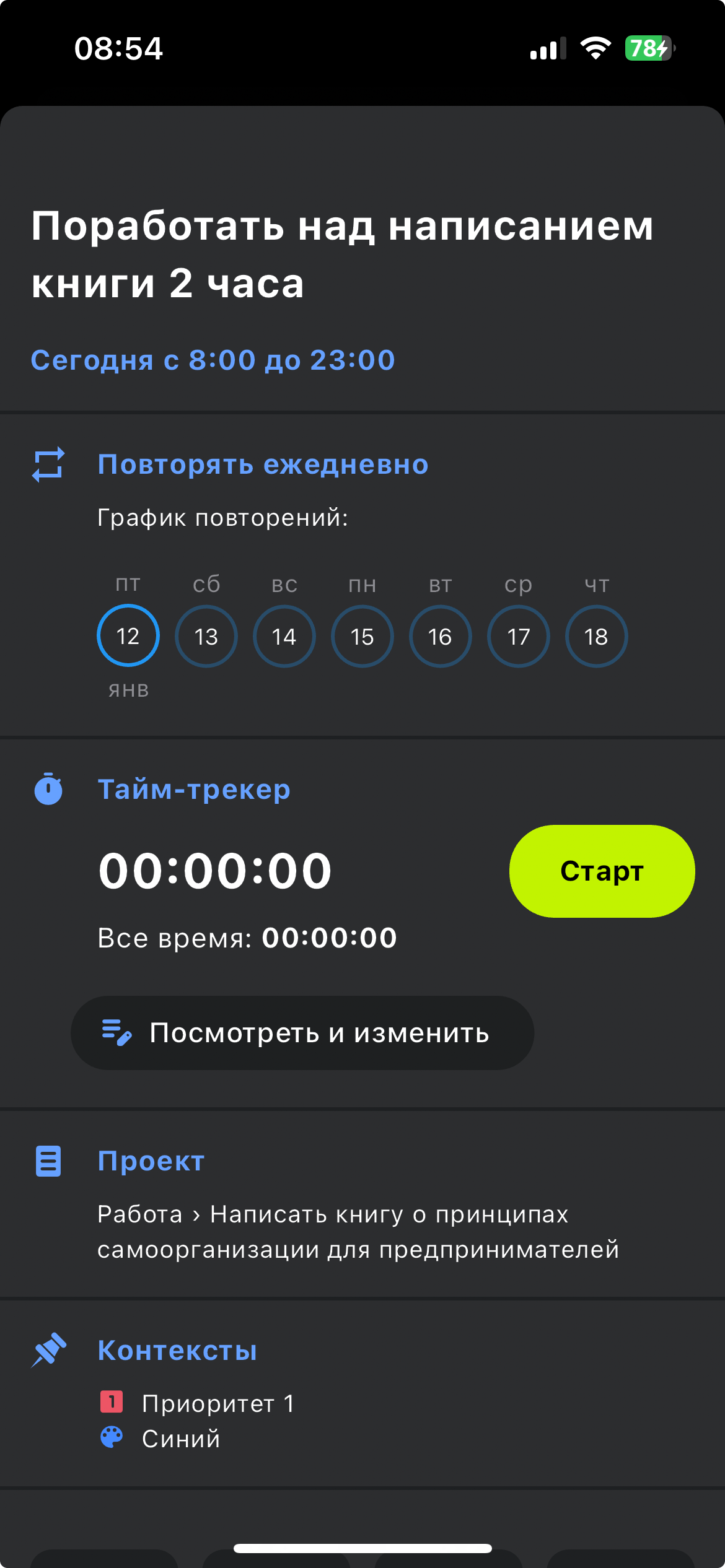 2. Перед началом каждой сессии работы над книгой запускайте тайм-трекер в диалоге просмотра задачи: