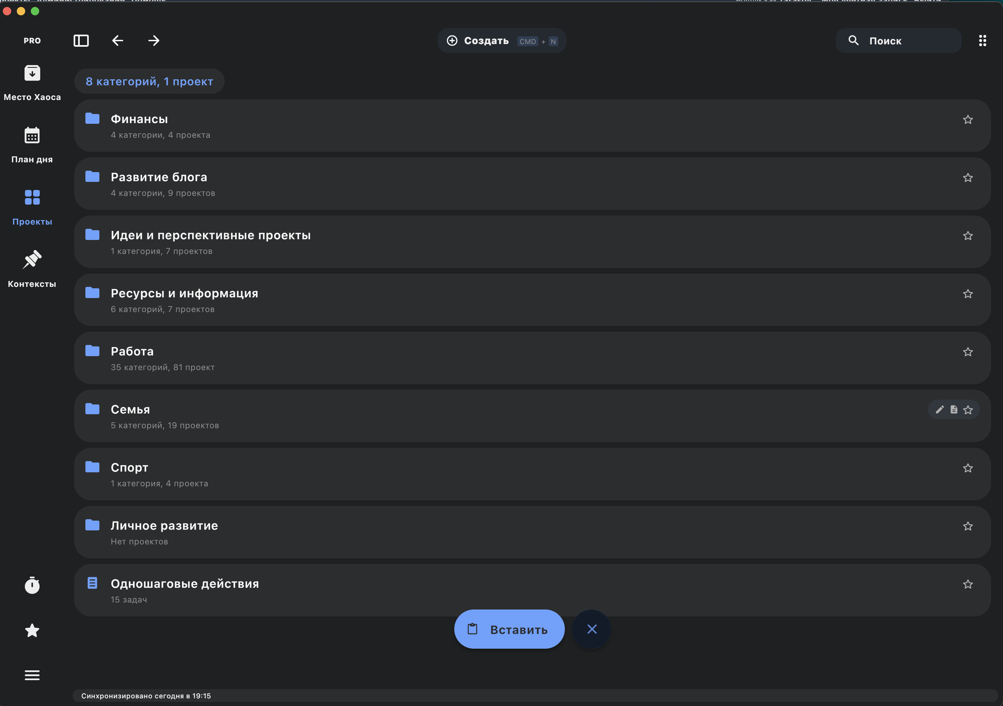 Также кнопка «Вставить» появляется в верхнем системном меню, если в буфере обмена есть скопированная задача/проект/категория: