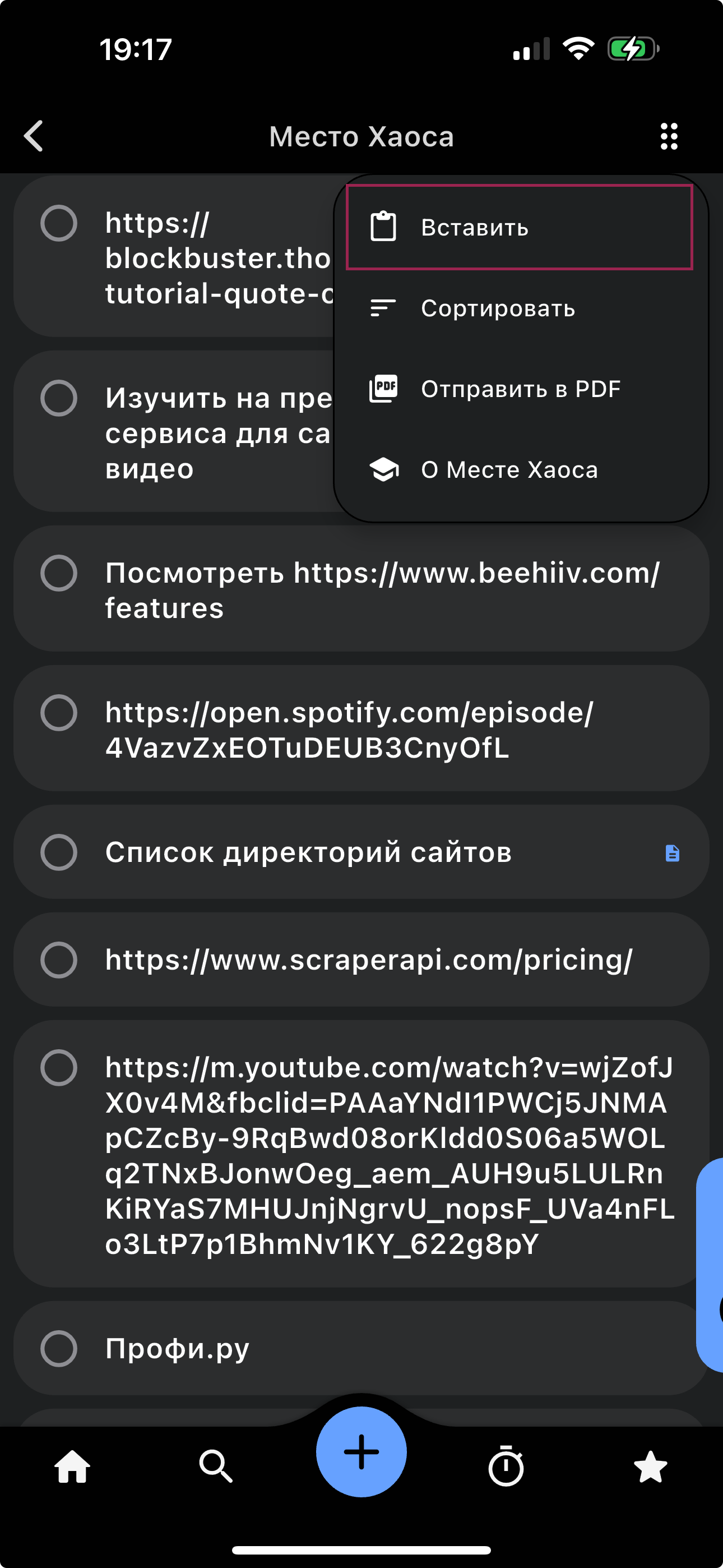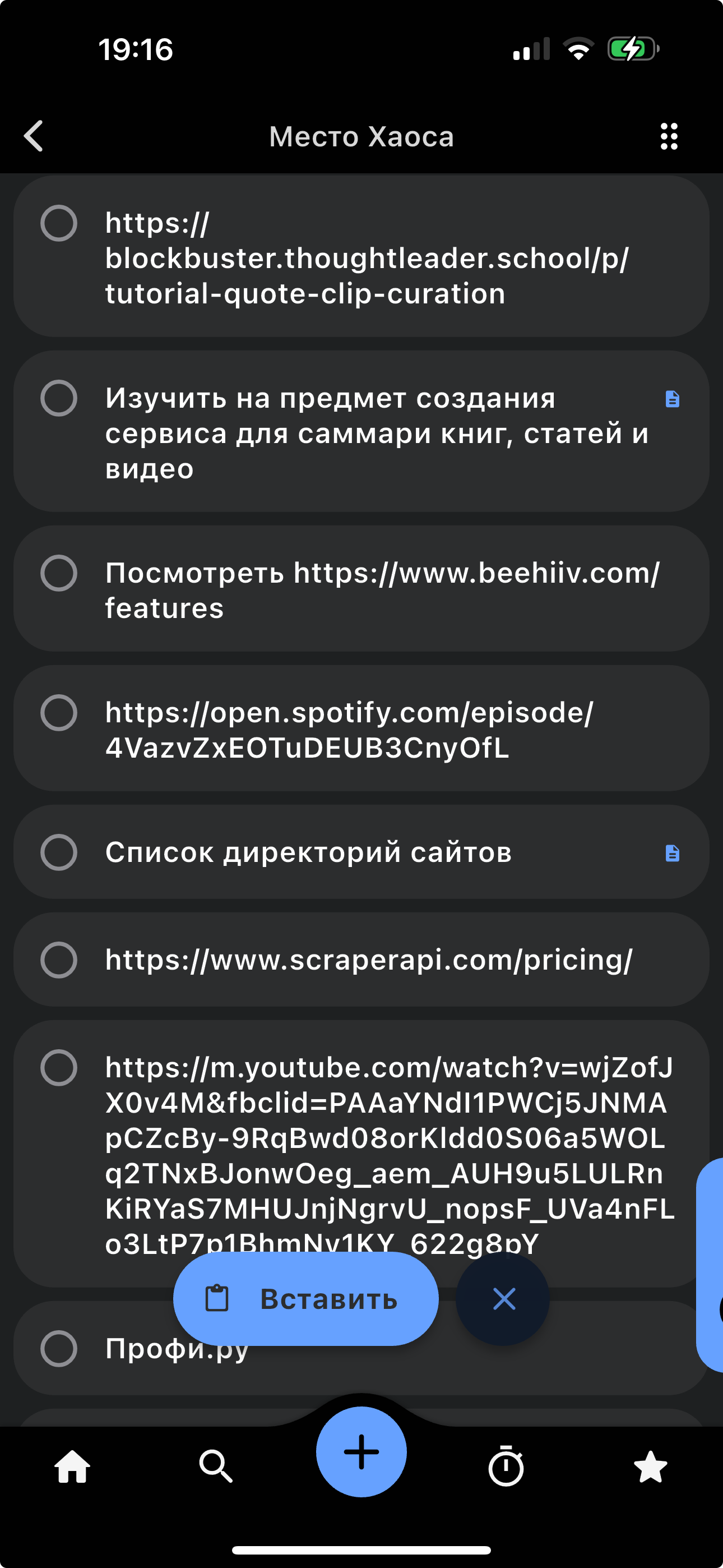 После нажатия на «Копировать» внизу экрана появится кнопка «Вставки», которая будет активна в любом списке, который подходит для вставки скопированного объекта: