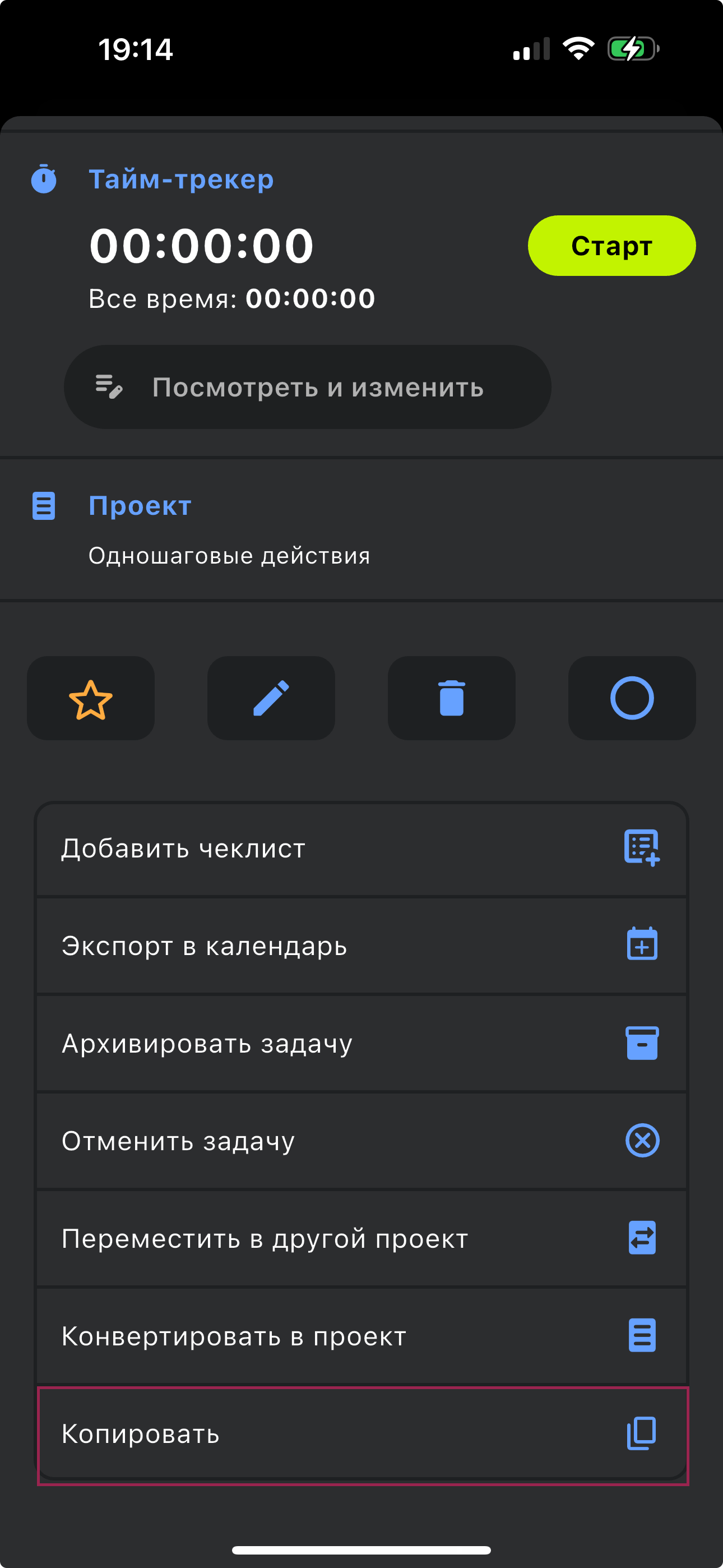 При этом кнопка копирования в мобильном приложении находится на диалоге просмотра задач, проектов, категорий и контекстов: