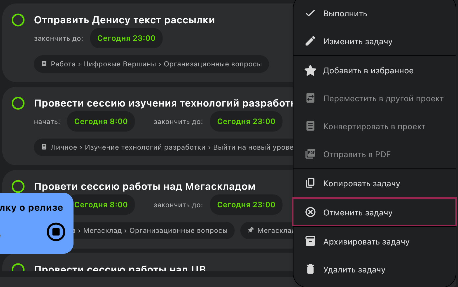Если вы создали задачу, и она потеряла актуальность, то теперь ей можно поставить статус «Отменено». Соответствующая кнопка добавлена в контекстное меню на ПК: