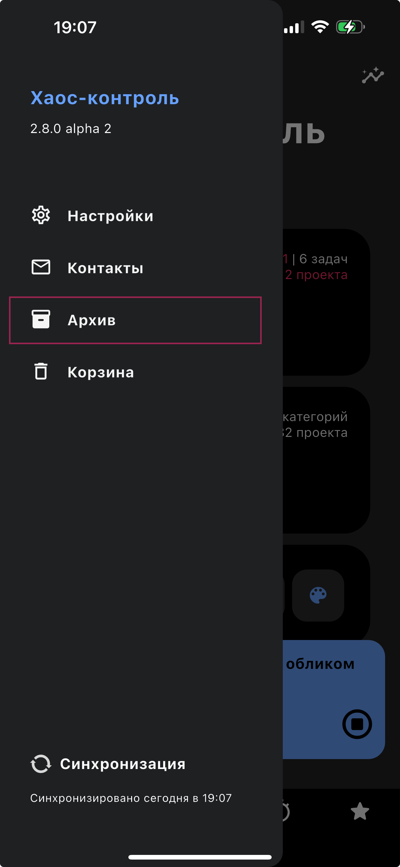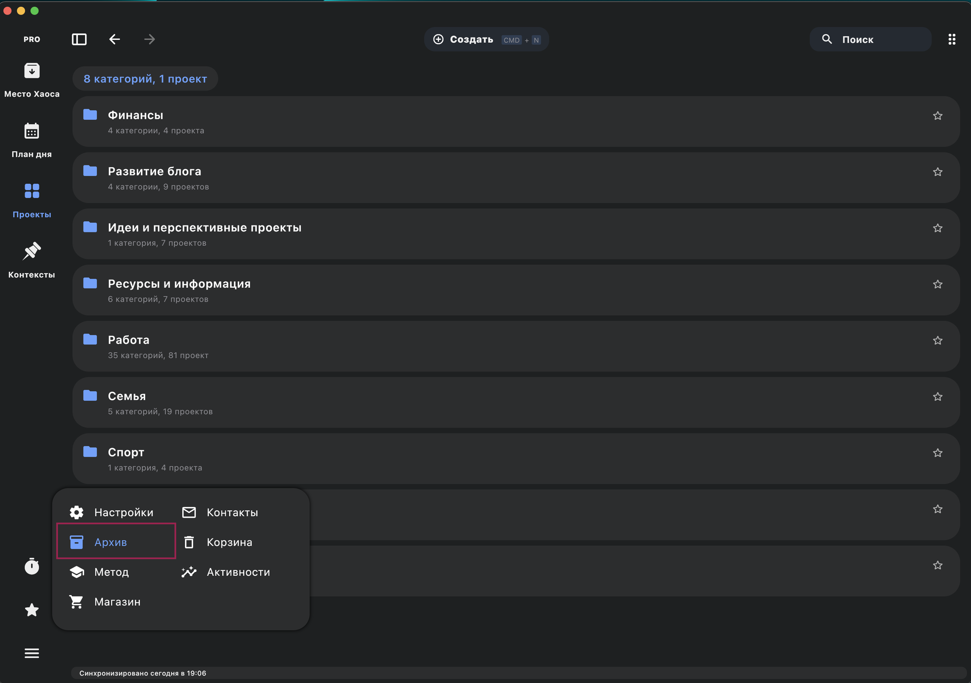 Аналогичным образом можно отправлять задачи и проекты в архив.
