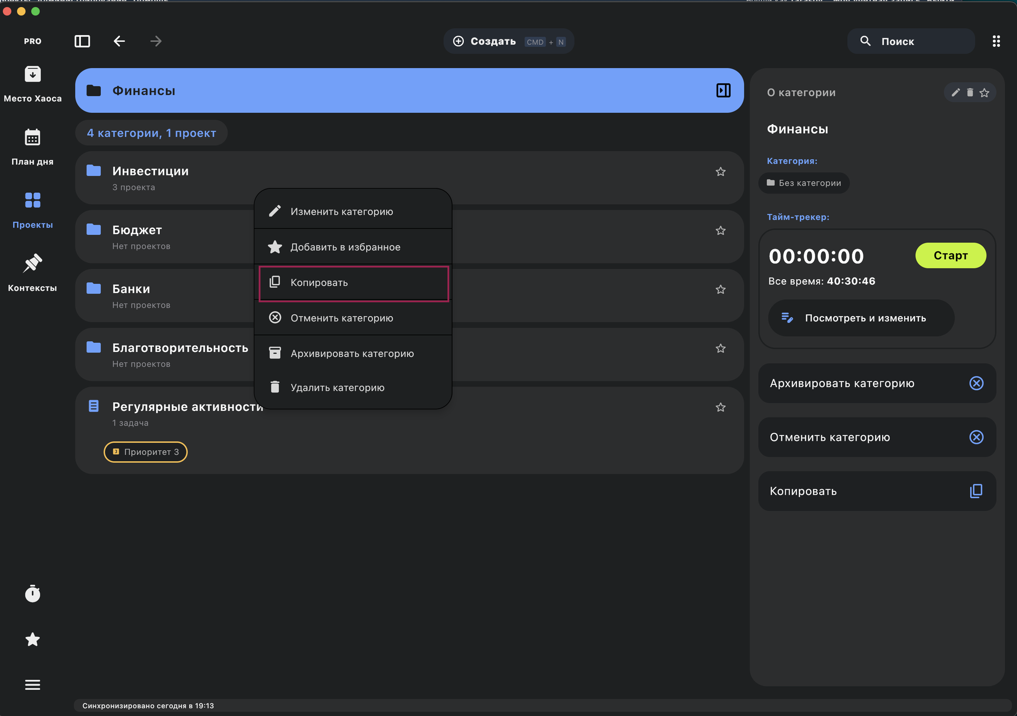 Теперь можно копировать задачи, проекты, категории и контексты. Функция копирования доступна на ПК в контекстном меню при клике на нужный объект: